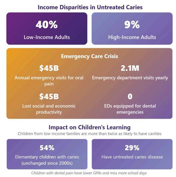 在经济影响方面,未治疗的口腔疾病每年在美国造成约450亿美元的社会与经济生产力损失。与口腔疼痛相关的急诊就诊每年花费同样超过450亿美元,仅2017年就有210万次因口腔疼痛引发的急诊就诊。